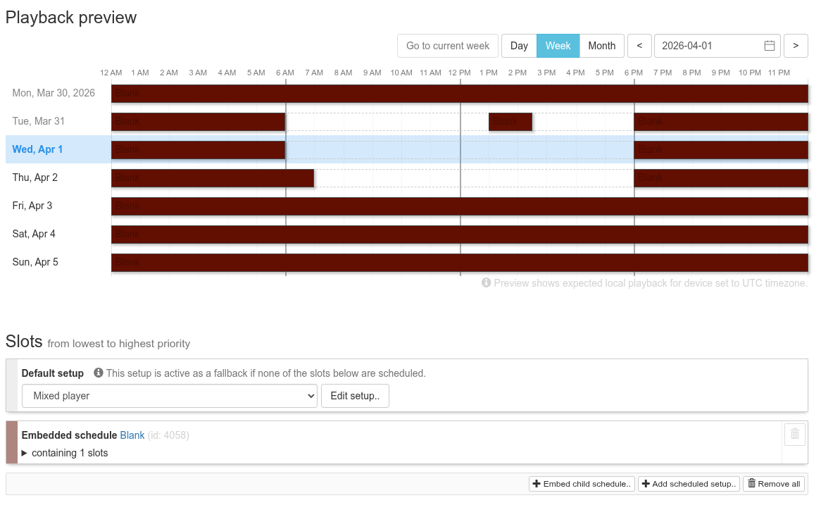 Basically this is now a schedule that always plays the default setup (the one showing your content). But then, thanks to embedding the Blank schedule, its “Blank screen” setups will be overlaid on top of that and take precedence, resulting in a turned off display when scheduled.